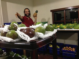 Die Ananas Mauritius sind diesmal alle um die 1,2-1,4kg und perfekt süß. Kleine Krone bedeutet wenig Wasser während der Wachstumsphase. Das heißt die Früchte sind konzentrierter. Die wilden Avocados, Red Lady Papayas und Sunrise Papayas sind top. Die Honeymoon Papaya ist von einer anderen Farm diesmal und etwas anders. Im Hintergrund seht Ihr auch bildhübsche Kakaoschoten, Passionsfrüchte, Maracujas und die wild gesammelten Grenadillen. Stachelannonen verschicken wir nur noch die größeren Früchte (1kg oder mehr) – die sind am Besten! Die Bananen werden gerade von unseren fleißigen Helfern gesäubert (abgepinselt). Naja, und ich werde gleich wieder loslegen und Eure Pakete zusammenstellen.